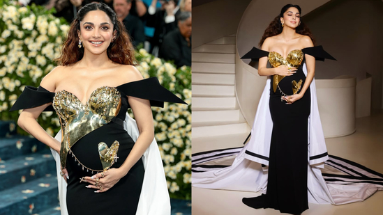 Actress Kiara Advani made a memorable debut at the Met Gala, celebrating both fashion and impending motherhood. She wore a gold ensemble designed by Gaurav Gupta, aptly named ‘Bravehearts,’ featuring sculpted hearts connected by a chain resembling an umbilical cord, symbolizing the bond between mother and child. The outfit also included a flowing double-panelled cape, paying homage to the late fashion icon André Leon Talley .