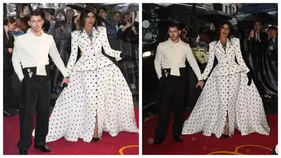 Priyanka Chopra Jonas returned to the Met Gala 2025 for the fifth time, accompanied by her husband Nick Jonas. She wore a retro white Balmain outfit adorned with black polka dots, a wide-brimmed hat, and Bulgari jewels, including an extraordinary 241-carat Magnus Emerald pendant. Nick complemented her look in a high-neck cream blouse and tailored trousers by Bianca Saunders, accessorized with Tiffany & Co. brooches .